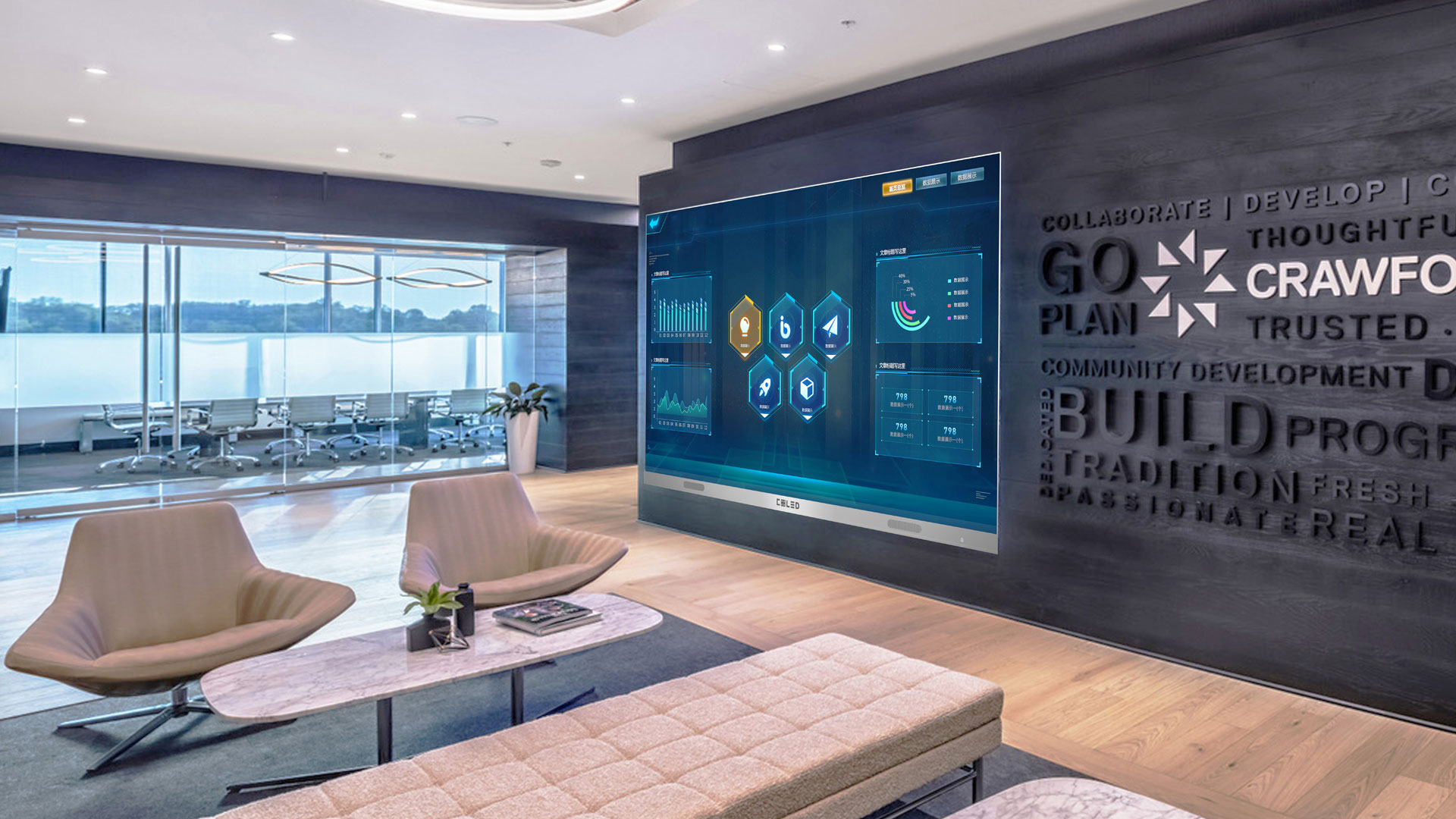 集全球领先LED 小间距技术、2K高清显示,安卓,视频会议,移动控制,高阶音响等为一体。